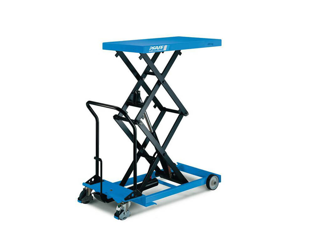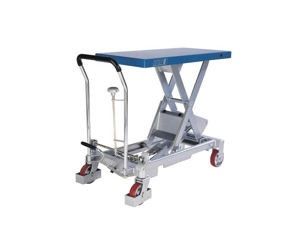 Nejčastějším typem zdvihacího stolu je hydraulický zdvihací stůl s nůžkovou konstrukcí. Tato manipulační technika má nosnost od 125 do 1 250 kg a lze tedy pořídit nůžkový zdvihací stůl, který co nejlépe odpovídá daným potřebám. V naší nabídce ale naleznete i plošinový vozík Pfaff Praktikus HP 0485, kde je zdvih plošiny realizován hydraulikou a ovládání prostřednictvím nožního pedálu.